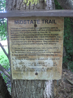 On Saturday, we set off on the final segment of the Midstate Trail. Three off us planned to hike the final 7.72 miles to the northern terminus. We met up at the Mount Watatic parking lot and left one car and drove down to Rt. 12. Ben checked to see if his snake friend from the week before was there but the snake had moved on. We set off down the road a piece until we noticed that they yellow triangles disappeared. Fortunately, we hadn't gone too far as we found this sign tucked back in the woods next to a yard and pointing us towards the trail.